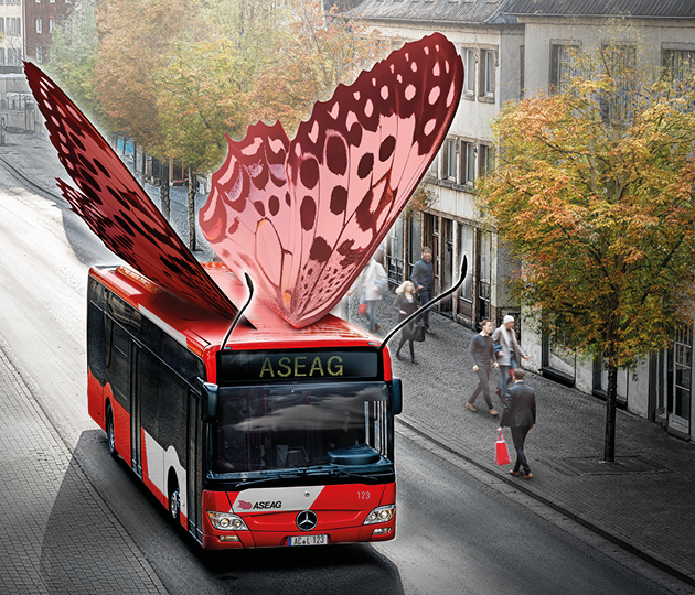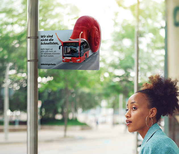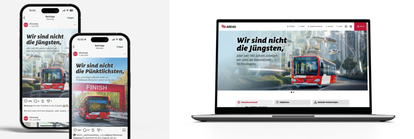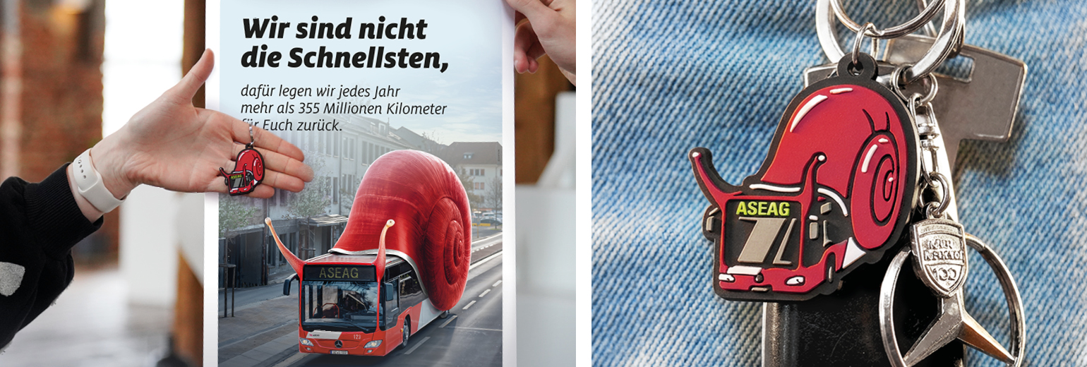 Für die teils verrückten Visuals haben wir auf einen Mix aus Illustration, Foto und KI gesetzt. Die frechen Motive mit den überraschenden Sprüchen begleiten die Fahrgäste durch den gesamten Tag, denn wir haben das Design für zahlreiche Marketingmaßnahmen übernommen: von Citylights, Bushaltestellenschildern und Anzeigen über Header für die Website, Social-Media- und Blog-Posts bis hin zu Schlüsselanhängern und Gummibärchenpackungen. Auf Basis der Visuals haben wir außerdem einen Messestand für die Euregio konzipiert. Dadurch wurde die Botschaft der Kampagne so allgegenwärtig im Alltag wie die ASEAG selbst. Ziel erreicht!