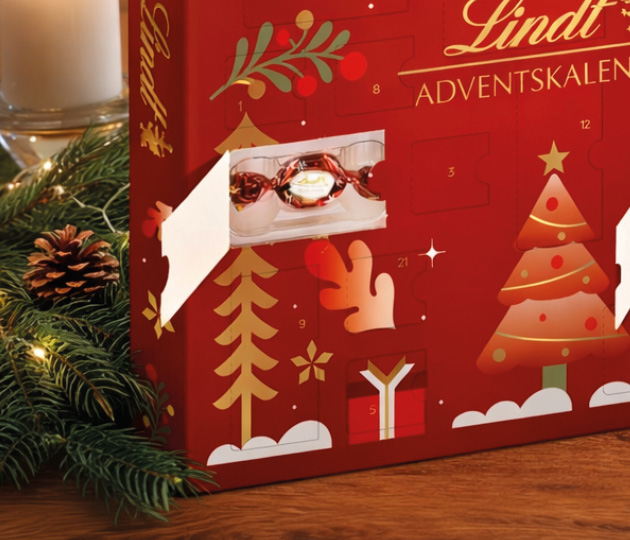 Ein süßer Countdown: Für den Schokoladenhersteller Lindt durften wir einen Adventskalender mit Auslage-Tray gestalten. Mit viel Liebe zum Detail haben wir die Markenwelt stimmungsvoll inszeniert und die süße Vorfreude auf Weihnachten Tag für Tag erlebbar gemacht.